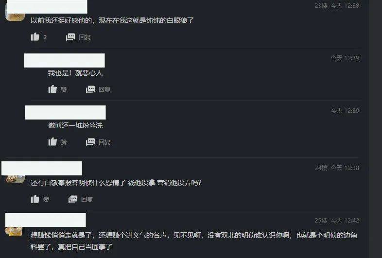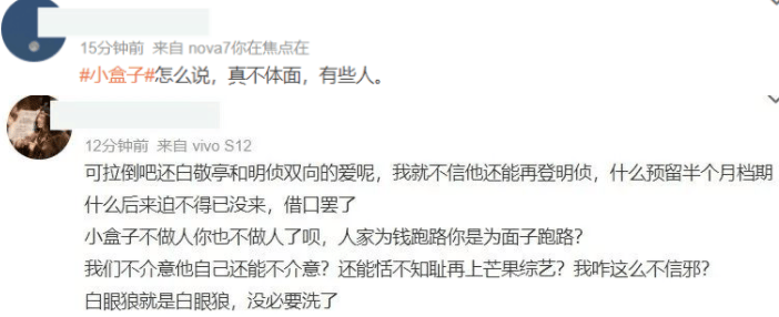 果不其然,随着白敬亭新综艺曝光,《明侦》观众直接“炸”了,有人还算含蓄,默默说了一句有些人真不体面,有人毫不客气,点名道姓直接怒斥白敬亭——“小盒子不做人你也不做人了呗?白眼狼就是白眼狼!”