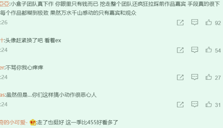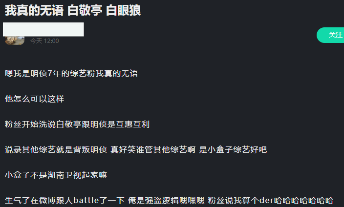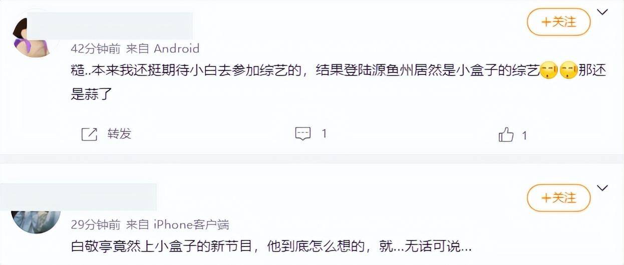 可现在白敬亭上了小盒子团队的新综艺,对于《明侦》节目粉来说,再充分的理由也变成了借口,看看他们的吐槽,似乎真的很生气。