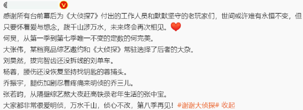说到何炅,称他是第一季到第七季唯一不变的定数,说到大张伟,透露他推掉了某档竞品综艺邀约和《大侦探》常驻,说到刘昊然,也说他拔了智齿还没拆线就上节目,说到杨蓉,也强调她腰伤未愈,说到乔振宇,人家也是忍着腿伤加剧痛,还有张若昀,有其他综艺同时录制也要熬大夜赶高铁来录制《明侦》。