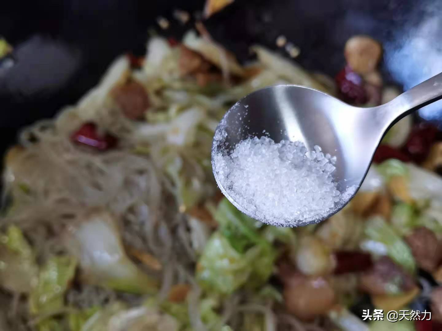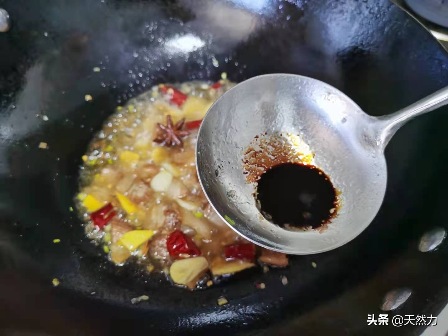 14、下面进行一个简单的调味,先加入小量的盐增味,注意了,盐一定不能多加,因为前面加了老抽,后面还要加生抽,这2种酱油都带咸味的,所以盐一定要少加或者不加。