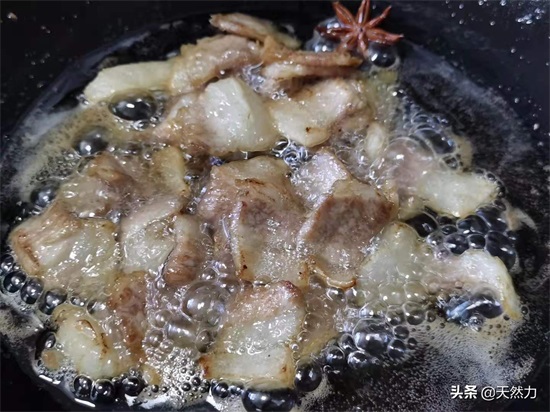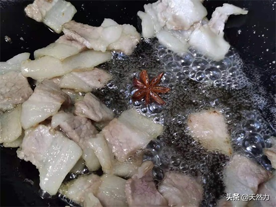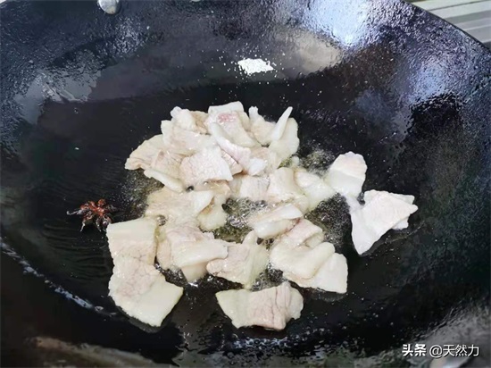 6、酒店一般在炒肉时都会先润锅,我们在家就可以省略这一步,但是一定要把锅烧热,烧到开始冒烟后再加少许的油进去滋润一下锅面,这样肉下锅后也更不容易粘锅,建议油不要加太多,有平时炒菜一半的油就可以,因为五花肉会煸出很多油来,油温2成热的时候就改小火,然后把八角放进锅内,先把八角的香味激发出来,记得改小火,要不然容易把八角烧焦。最多5秒后就可以把五花肉倒进锅内开始煸炒。