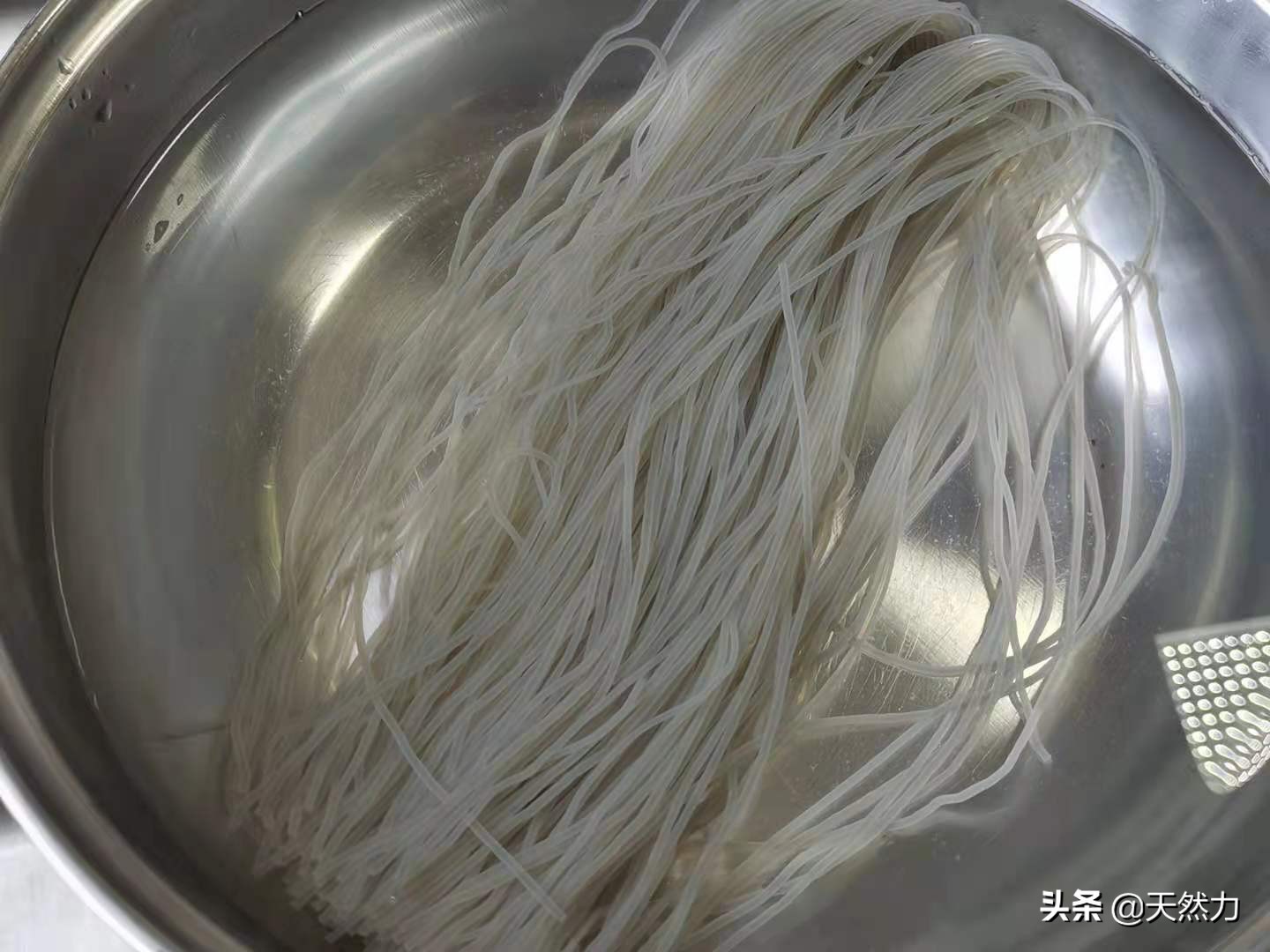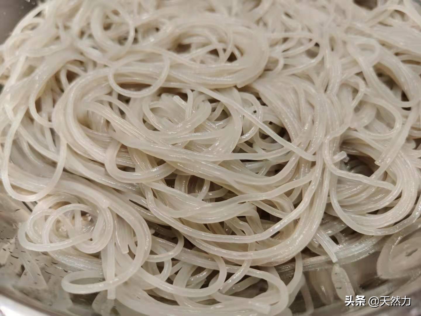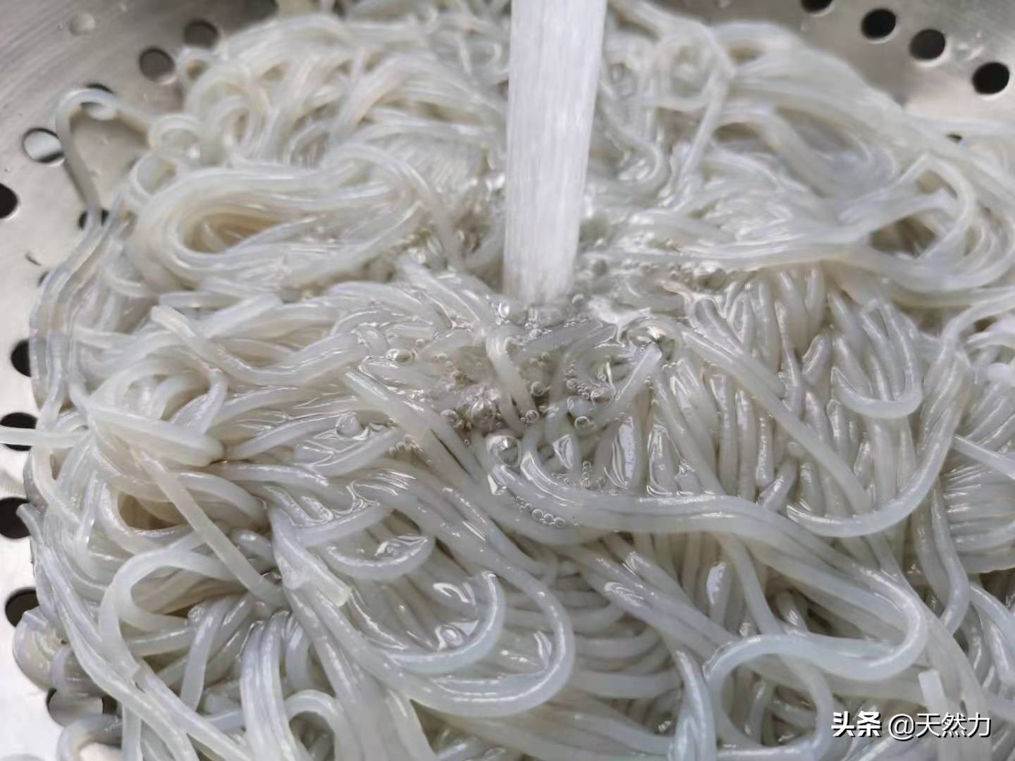 2、粉条捞起来后马上用冷水过凉(用冷水多冲几遍,让粉条的温度迅速降下来),这样粉条就不会坨在一起。酒店炒的话就不会有煮粉条的这个步骤,泡软的粉条直接下锅炒,我们在家做这道菜的时候,只要粉条泡得足够软,一样可以把这个步骤省略。
