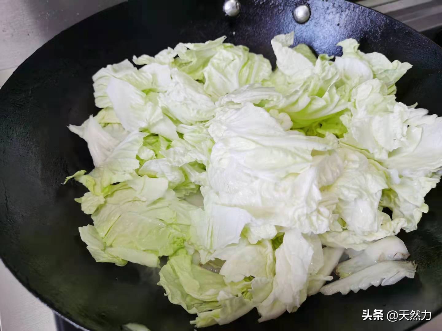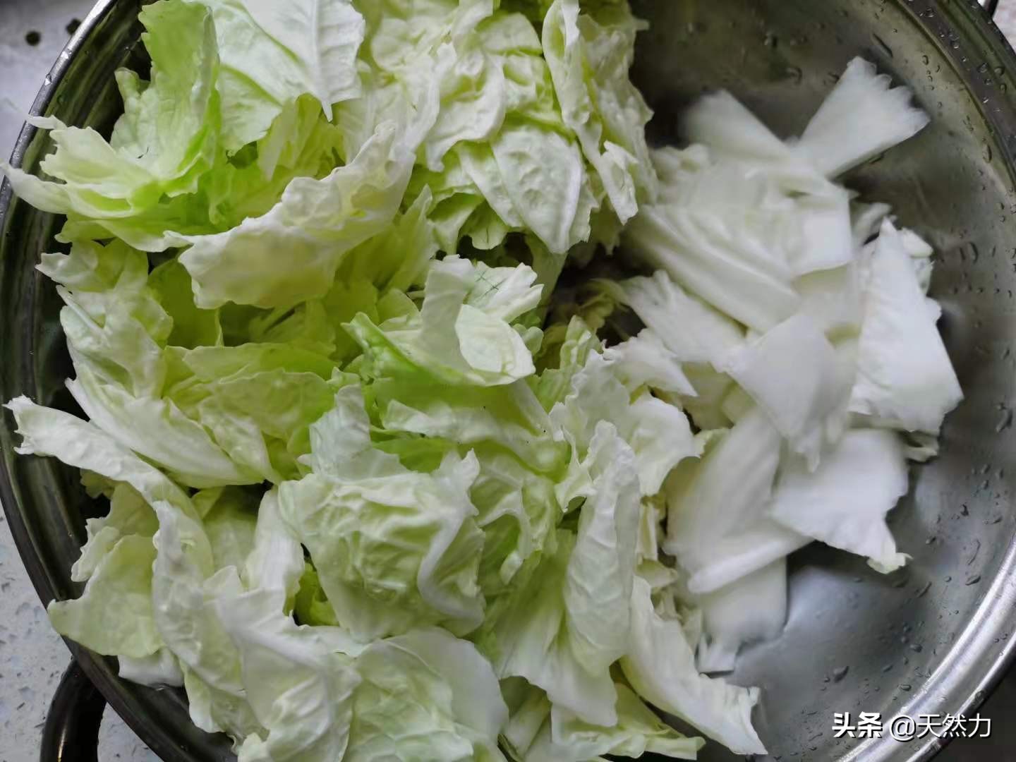 斜刀把白菜帮斜切成片,叶子用手撕成小块,白菜帮和白菜叶分开放。因为白菜帮含水量高,所以实际上我才用了一半。
