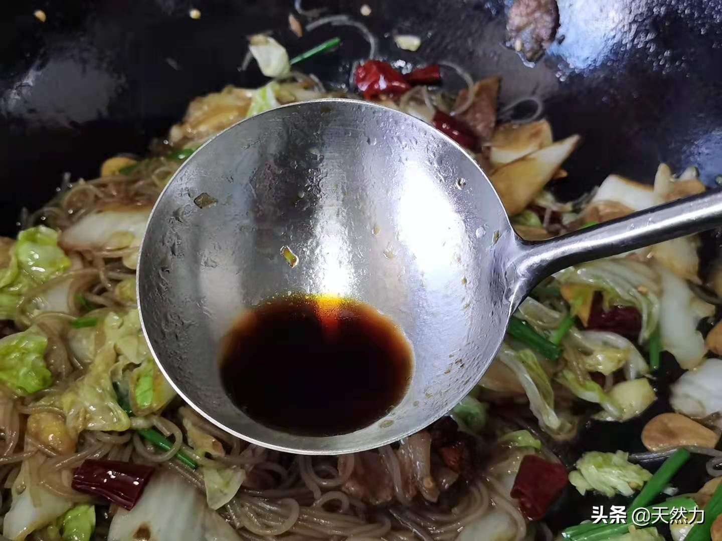 16、加入生抽提味,这次加入的生抽可以比平常炒菜时的量更大,让粉丝更入味才好吃。