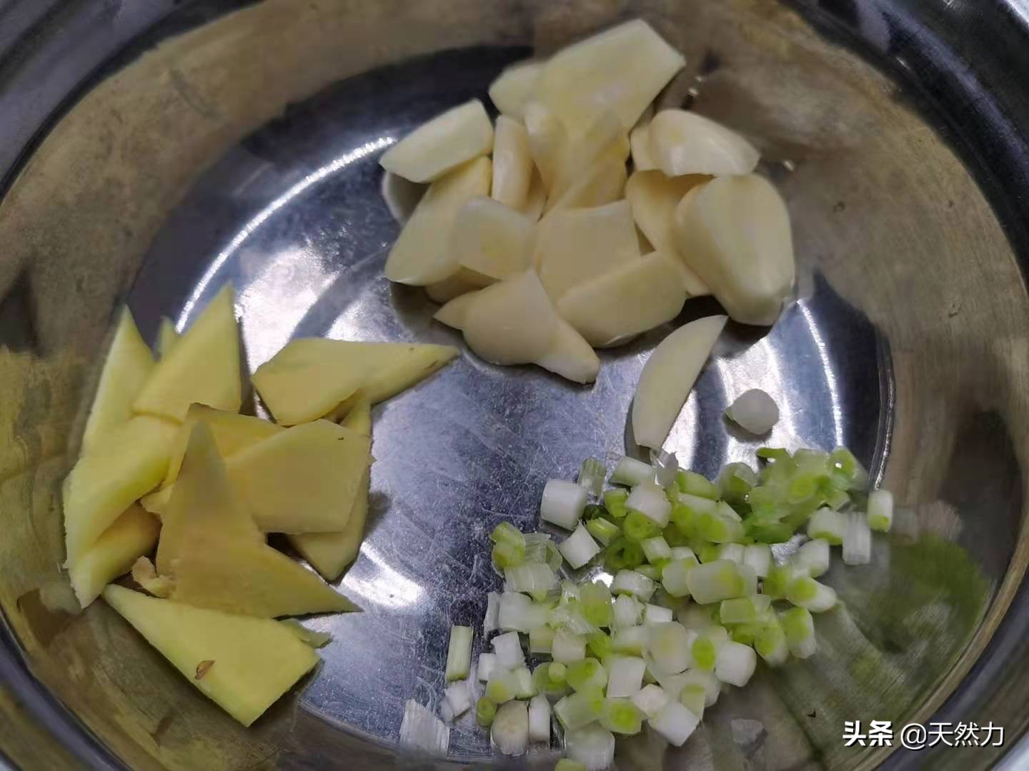 【配料】:蒜子3瓣、生姜1小块、小葱3根、八角1个。