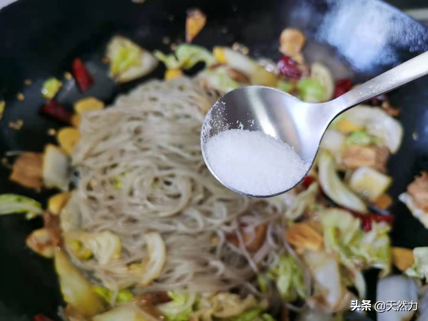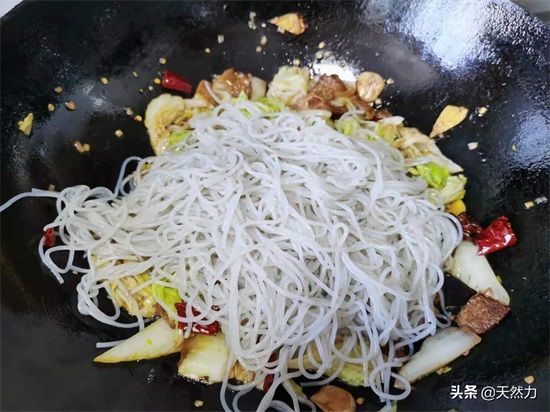 13、把白菜翻炒均匀后改小火,把红薯粉倒进锅内。