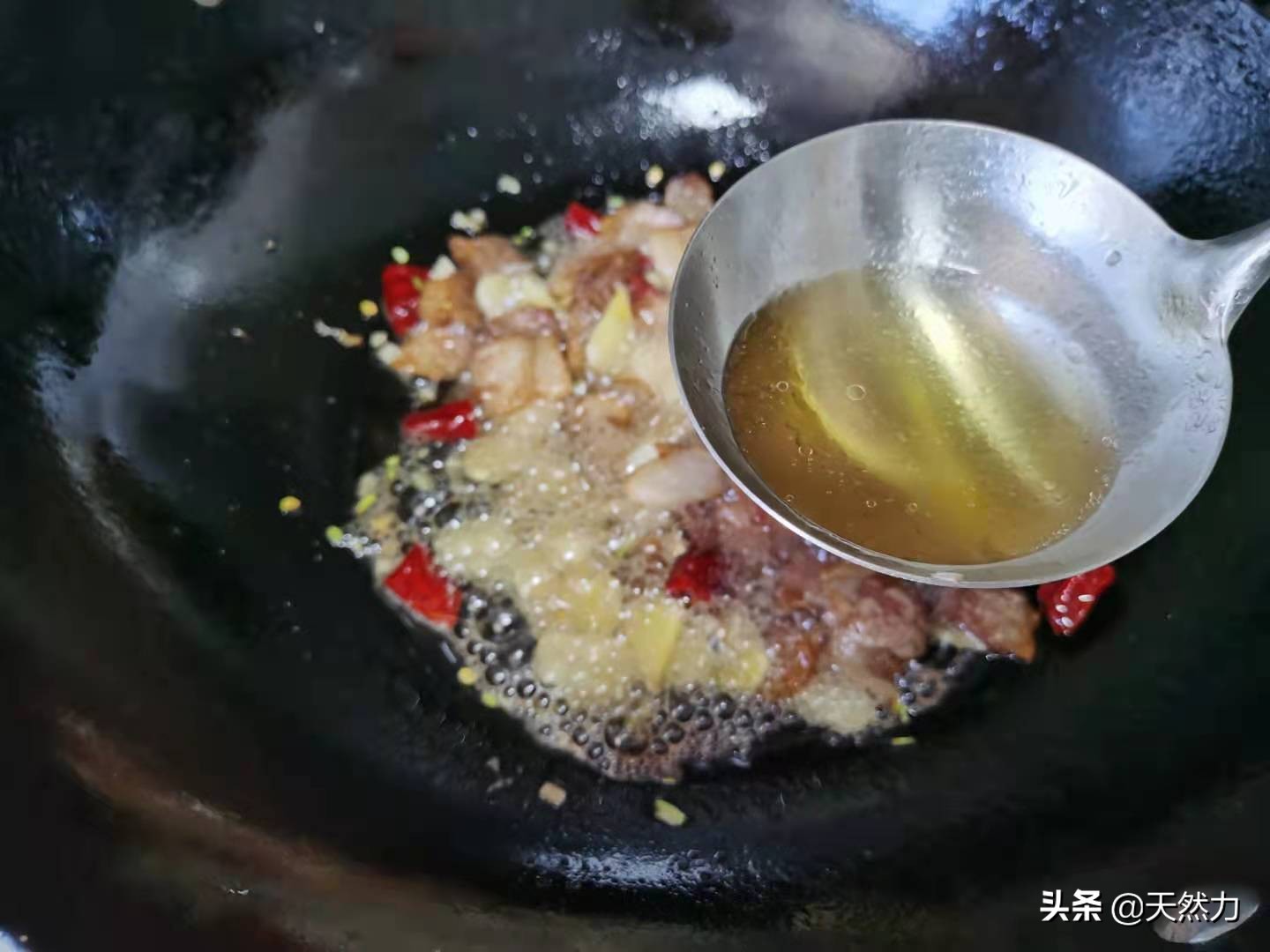 10、料头下锅后大概20秒左右的时间,就可以从锅边淋入料酒去腥增香,翻炒均匀。