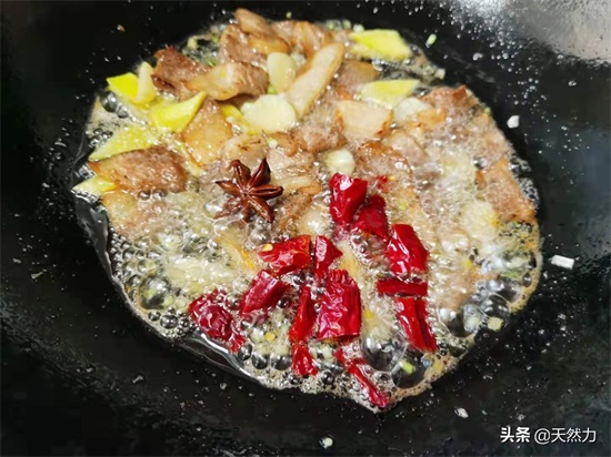 7、小火慢慢的煸炒出五花肉的油脂,炒出五花肉的香味,同时也要把八角的香味炒进肉片里,要不停的煸炒,这样五花肉才能均匀受热,这样也能让五花肉更快的出油。