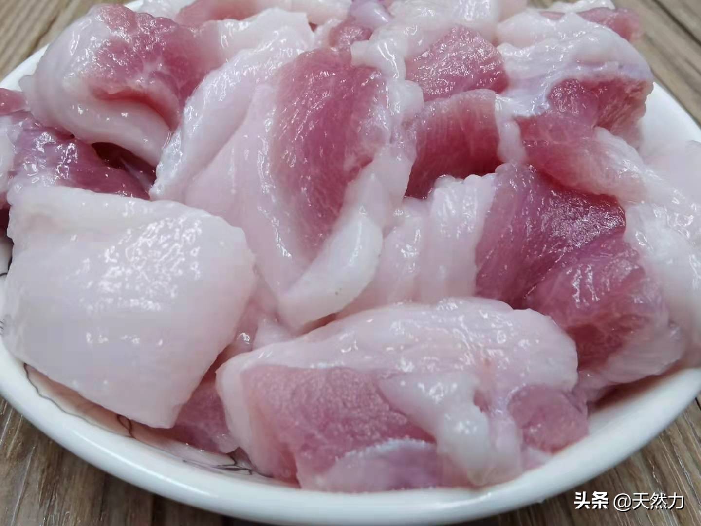 2、五花肉切片,五花肉先去皮(这里我建议把猪皮去掉,因为炒制的时间短,所以这个皮可能会咬不动),再切片(可以先放冰箱冷冻一下再来切片,这样切起来就容易多了,切出来的厚度也更均匀,在冻的时候别冻死了,冻到定型就可以),切好后放一边备用。