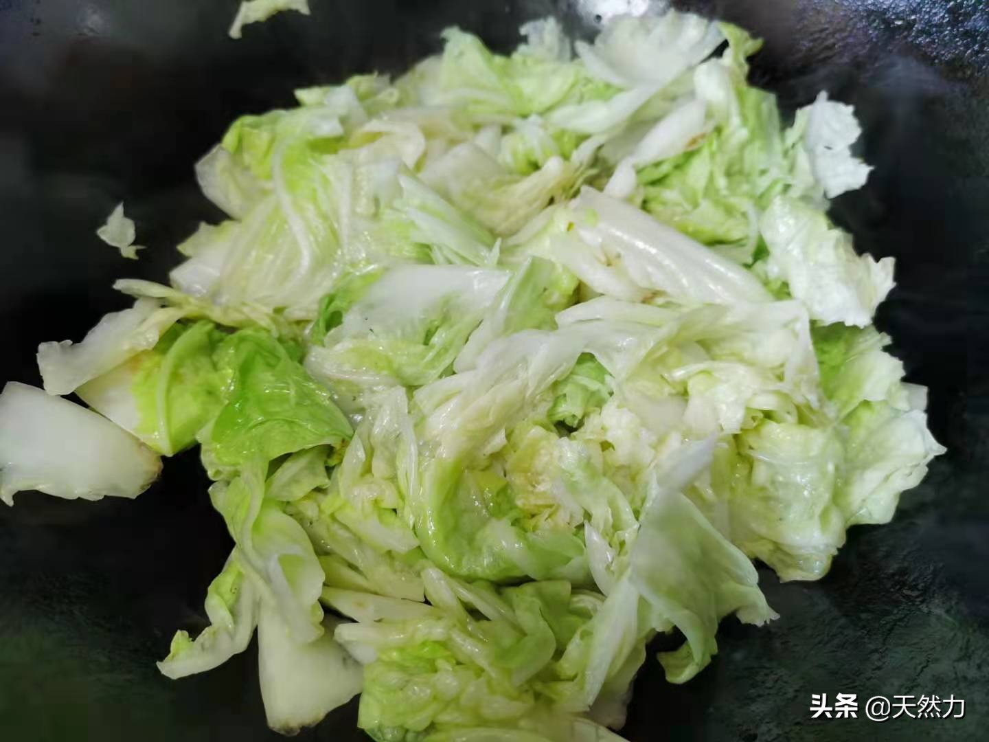 12、然后就可以把炒好的白菜倒入锅内,开大火煸炒均匀,前面经过处理后的白菜基本上是不出水,吃起来也就会更香了。