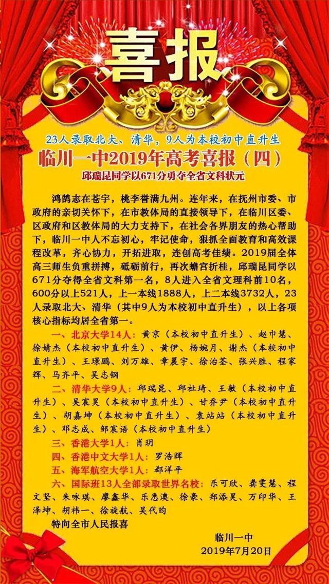 23人清华北大,600分以上521人,临川一中不愧江西排名第一中学