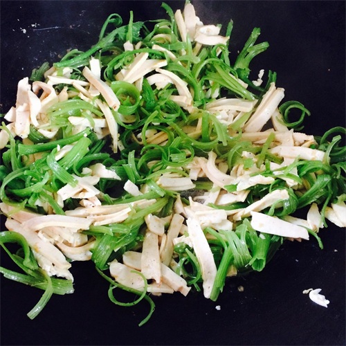 步骤一:把带毛绒的南瓜杆剥去皮,掐成段,它会变的卷曲