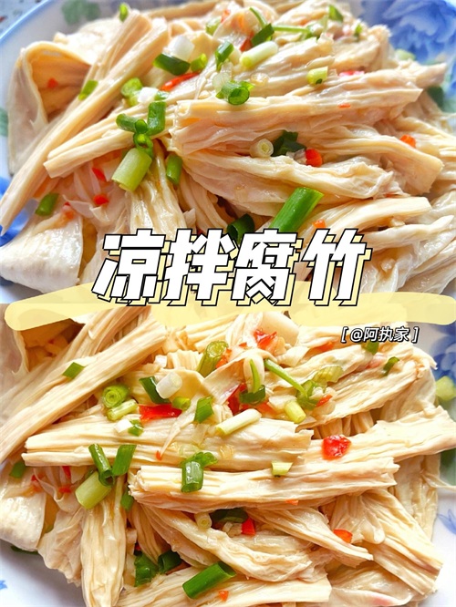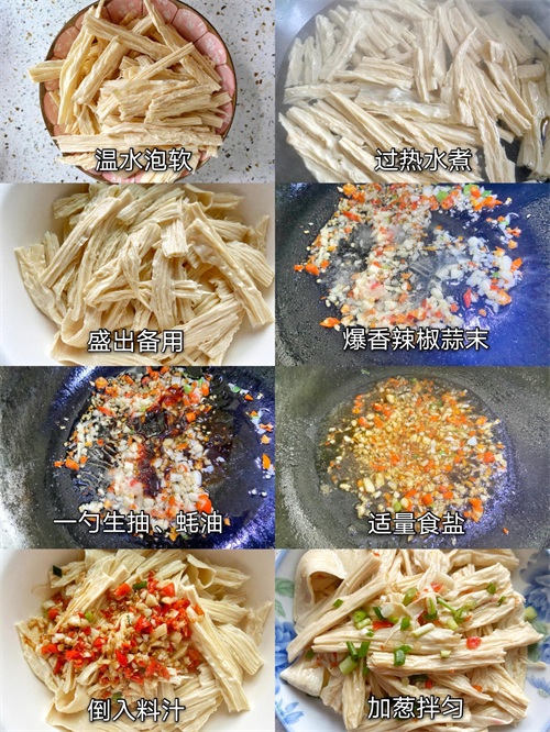 ️腐竹提前用温水泡软,过热水煮15~30秒钟。别煮多了哈,煮太软就不好吃了。️调下料汁:热油中加入辣椒、蒜末、一勺盐、一勺生抽、一勺蚝油炒香出锅