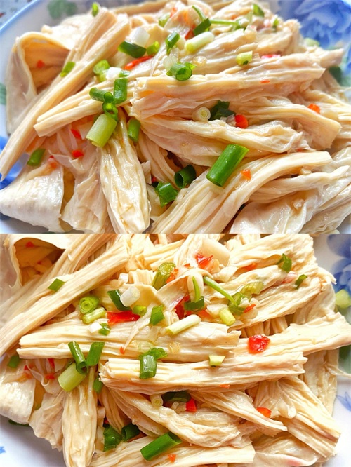 ️调好的料汁倒入腐竹中,加点香葱拌匀,美味的凉拌腐竹就做好啦~