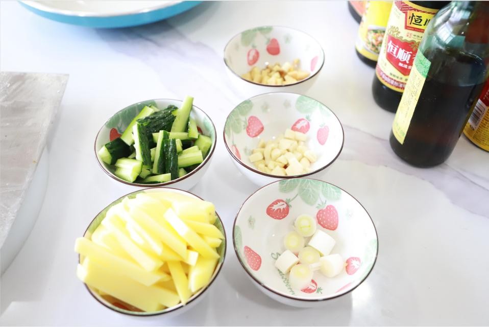 一、准备好的海虾用刀开背,土豆和黄瓜切成长条状。起锅烧水,放入少许盐调配底味,水开倒入土豆条,煮到七八分熟捞起沥干。