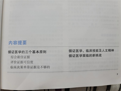 在总结循证医学实践所需的技能基础上,强调了循证医学,如何补充、完善传统的临床医学。《循证医学实践手册》的一位作者(重症医学专家)在一次重要的演讲前夕,发现自己的嘴唇上长了水疱,他对此感到很担心,想知道是否应该服用阿昔洛韦,于是他花了半个小时搜索和评价最高质量的证据,然而当他向妻子(一位经验丰富的牙科医生)谈及自己对应用阿昔洛韦的疑虑时,她却说:“亲爱的,这并不是单纯疱疹。”