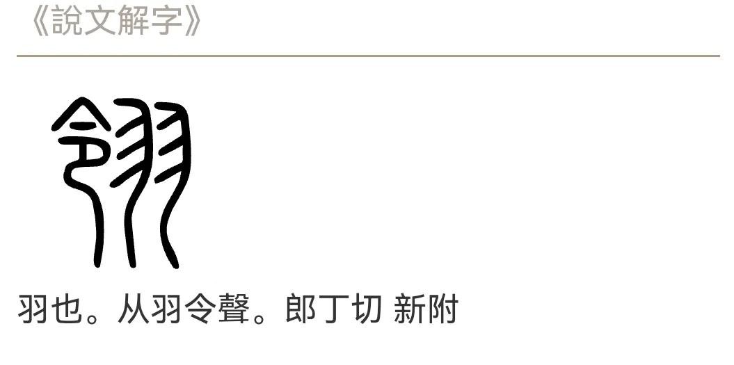 (1) (形声。从羽,令声。本义:翎毛,鸟翅和尾上的长羽毛)