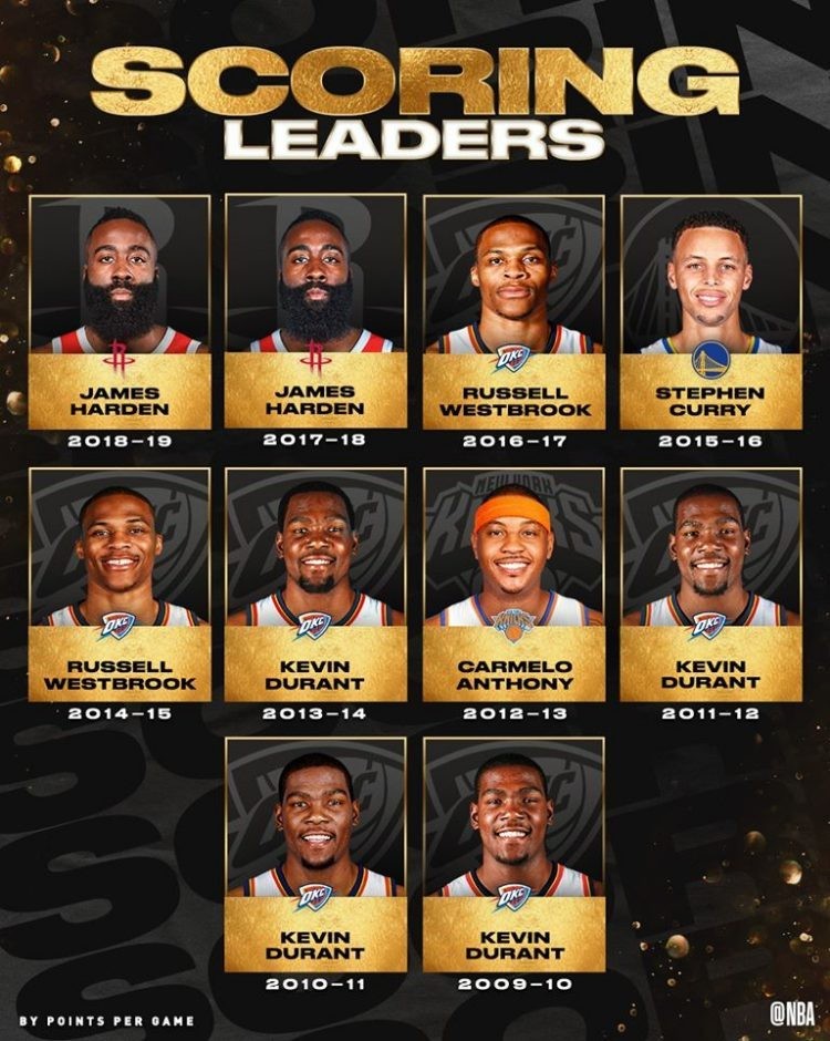 而在最近10年中只有5位得分王,分别是哈登、库里、威少、杜兰特、安东尼,杜兰特在09-15赛季这5年中4次拿到了得分王,其中连续3届得分王,这也是乔丹之后拿到得分王次数最多的球员了。