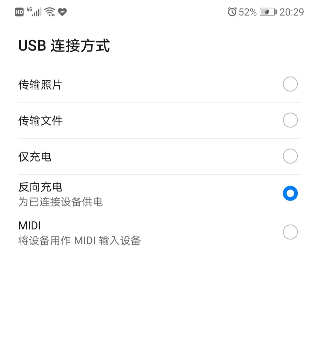 3.在待充电设备上,根据提示选择“充电”。主机显示为“正在向已连接设备供电”即可。