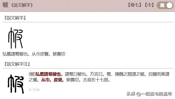 造字法:形声字;从巾、皮声