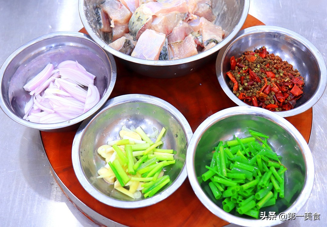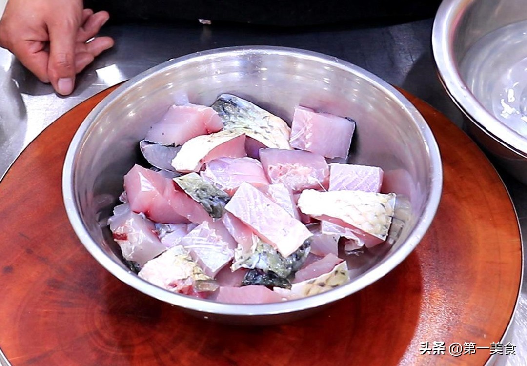 准备草鱼一条,已经提前宰杀干净,把鱼头切下来抽出鱼腥线,沿着脊骨把鱼肉片下来,鱼骨和鱼肉分别剁成小块,放在清水中洗干净。