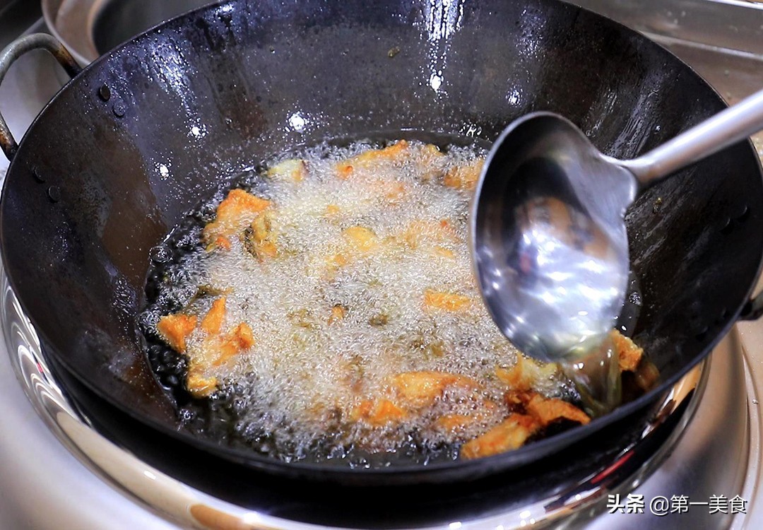 锅内烧油,油温五成热时,把鱼块依次放入锅中,开小火慢慢炸,鱼块没有定型的时候不要翻动,可以轻轻晃动锅以免糊底,直至鱼块炸成金黄色鱼刺都非常焦酥时捞出来控油。