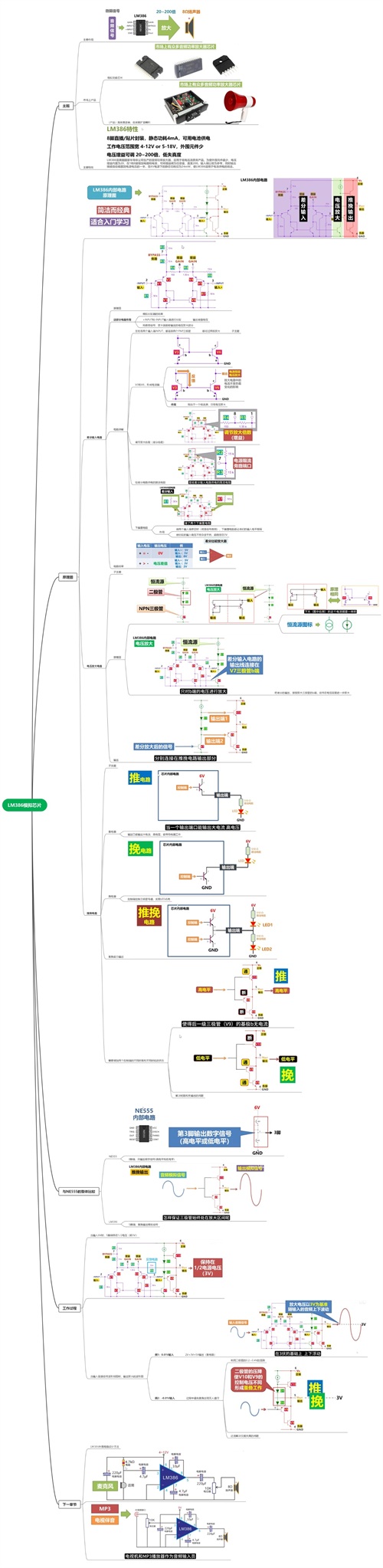 该思维导图主要介绍了 LM386 模拟芯片 的基本概念、功能特点、电路应用及其相关案例。以下是对其主要内容的解析: