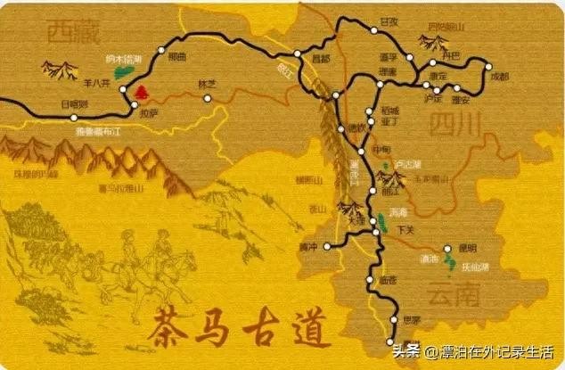 茶马古道是唐宋以来形成的辐射滇、藏、川西南边疆地区及缅甸、印度等东南亚、南亚国家,以骡马为主要运输方式,以茶马贸易为主要内容的民间商贸交流通道。在地理空间上,茶马古道横跨滇、藏、川三大民族聚居区,跨越喜马拉雅山和横断山脉,其外围向北可深入新疆、青海、甘肃与北方丝绸之路会合,向东可延伸至广西、贵州,湖南等省区,向西可抵尼泊尔、不丹和印度,向南和东南可延伸到东南亚的缅甸、越南、老挝等国,并辐射东南亚、南亚、西亚的其他一些国家和地区。其线路主要分为滇藏道、川藏道和青藏道(唐蕃古道),其中,滇藏道由今西双版纳、普洱等茶产地出发,向西北经景谷、镇沅、景东、南涧、巍山、大理、鹤庆、丽江、香格里拉、德钦到西藏的芒康、左贡、昌都等直至拉萨,再从江孜、亚东分别到缅甸、尼泊尔和印度等地。