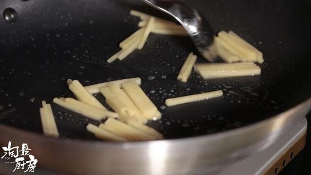 ❷ 开小火。锅中留底油,开小火将姜丝炒出香味。