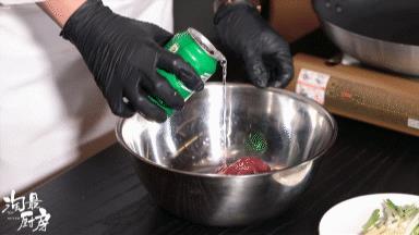 ❷ 吸饱水分。腌制的牛肉中加50ml冰镇的雪碧,继续抓拌均匀。