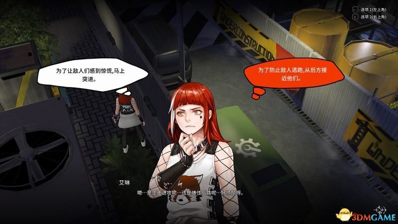 选择第一个艾琳会直接进入战斗,选择第二个则是等待进攻,比较稳。