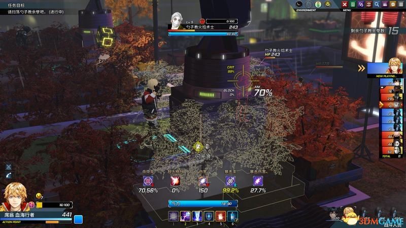 开场建议使用席翁的“闪光浪”技能,暴击率高,一下可以干掉好几个敌人。
