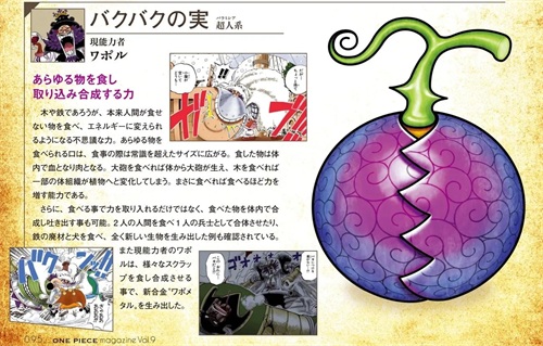 果实能力:可以吞下任何东西。能够将吞下的东西吸收进自己体内,变成身体的一部分,或者将它们进行合成。