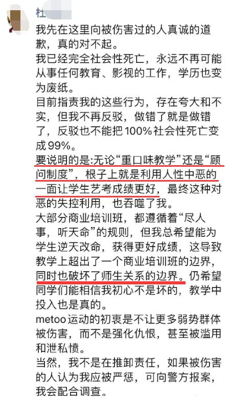 杜某很快在朋友圈回应,称长文不实、夸大。夸不夸大我们不知道,警方也已经在取证中,但是在杜某的回应中," 重口味教学 " 是他自己说的," 教学超出边界 " 也是他的说法。