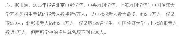 2015 年就有媒体报道,三大艺校和中国传媒大学报考人数近九万,但是北电只收四百多位学生,另外两所大学的总招生名额不到 1200 人。