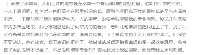 最可怕的是去泰国做集训营的时候,杜某也会借机约女生出去玩,身在异国他乡,面对在房间里脱掉上衣的肥腻男老师,女生都吓傻了,可发信息给别的老师都没有得到回应,可想而知当时女孩有多崩溃。