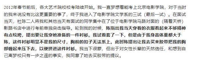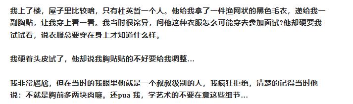 很多学生都提到,杜老师会要求女生穿衬衫去面试,接着以调整衣服为由摸女学生的胸部,如果学生表现抗拒,他会说 " 学艺术的不要在意这些细节 "。