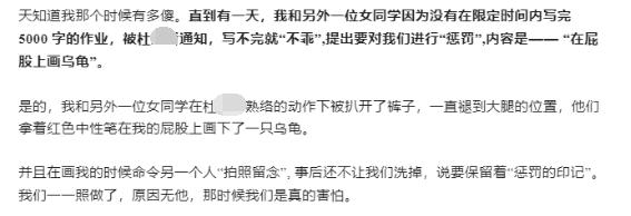 如果有人拒绝,他会用很凶的态度威胁,有女生因为没有在限定时间内写完作业,被杜老师勒令脱下裤子,在屁股上画乌龟。
