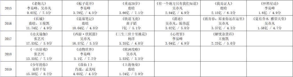 毒眸统计的 2015-2019 流量明星主演电影票房与豆瓣评分