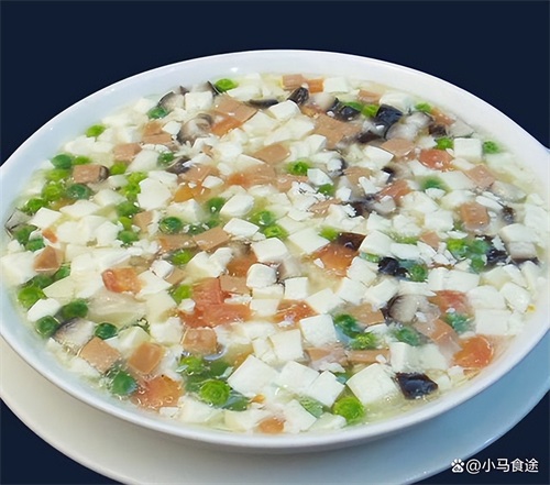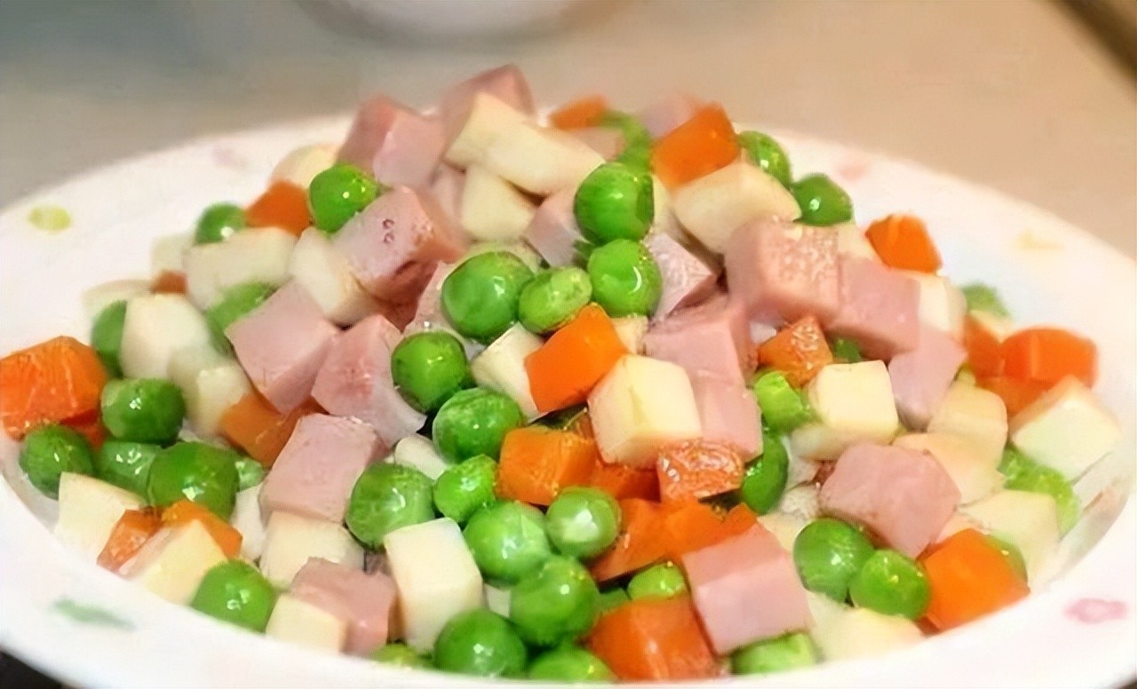 1.土豆去皮改刀切丁,火腿改刀切丁,胡萝卜改刀切丁。豌豆和土豆、胡萝卜下入开水锅汆烫一下,断生捞出备用。