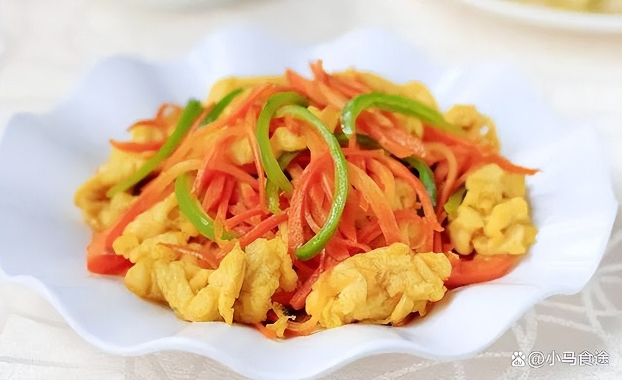 1.碗中打入几个鸡蛋,加点盐、胡椒粉搅打均匀。胡萝卜改刀切丝,青椒改刀切丝,木耳泡发改刀切丝。