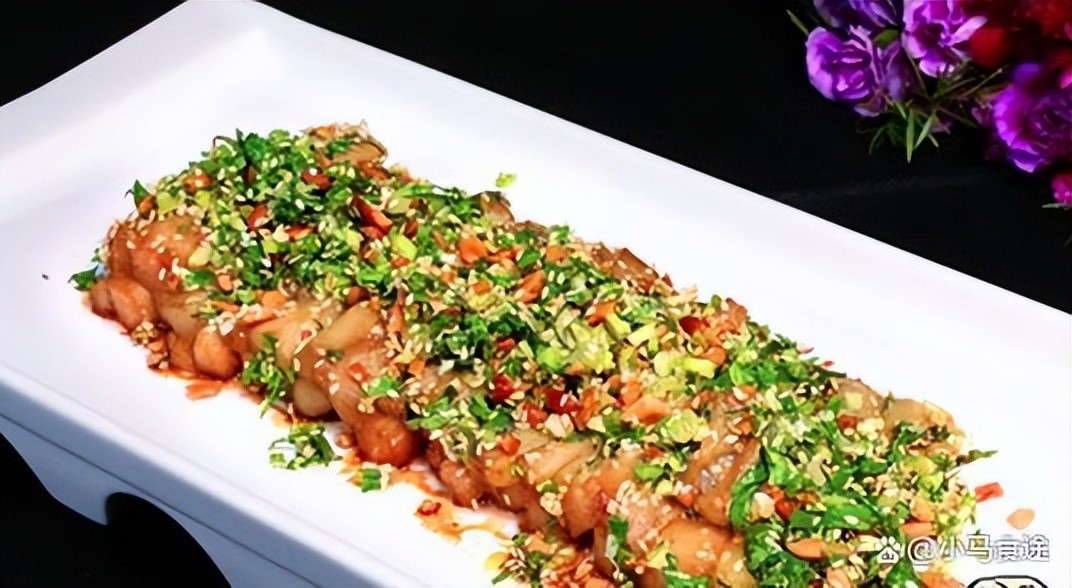 1.茄子切段,上锅蒸熟,挤一下水分,手撕成条,摆入盘中。