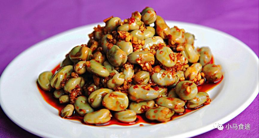 3.起锅烧菜籽油,加拍烂的大蒜,下胡豆,慢慢翻炒,翻沙,加盐、鸡精、味精、白糖、刀口海椒面,大火翻炒入味,再加入生抽,花椒面,香油,蒜苗,翻炒均匀,即可起锅装盘。