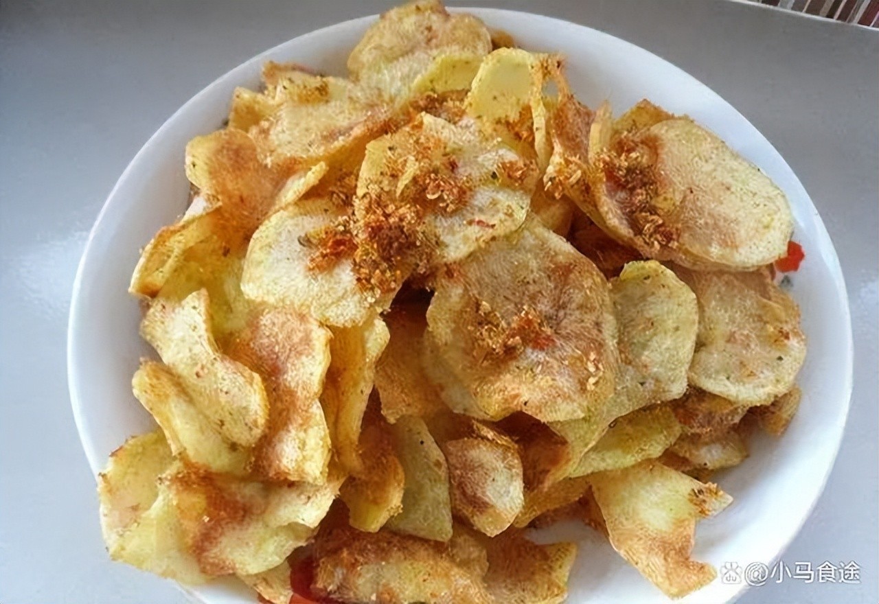 1.土豆去皮洗净,用擦板擦成薄片,放入淡盐水中浸泡并淘洗掉多余的淀粉,再重新放入清水中,加点可食用明矾浸泡片刻,再捞出控掉多余水分,拍上一层薄薄的脆炸粉,下入三四成热的油锅中,慢慢炸至酥脆,迅速捞出,稍微凉一下更脆,撒上麻辣鲜即可装盘。
