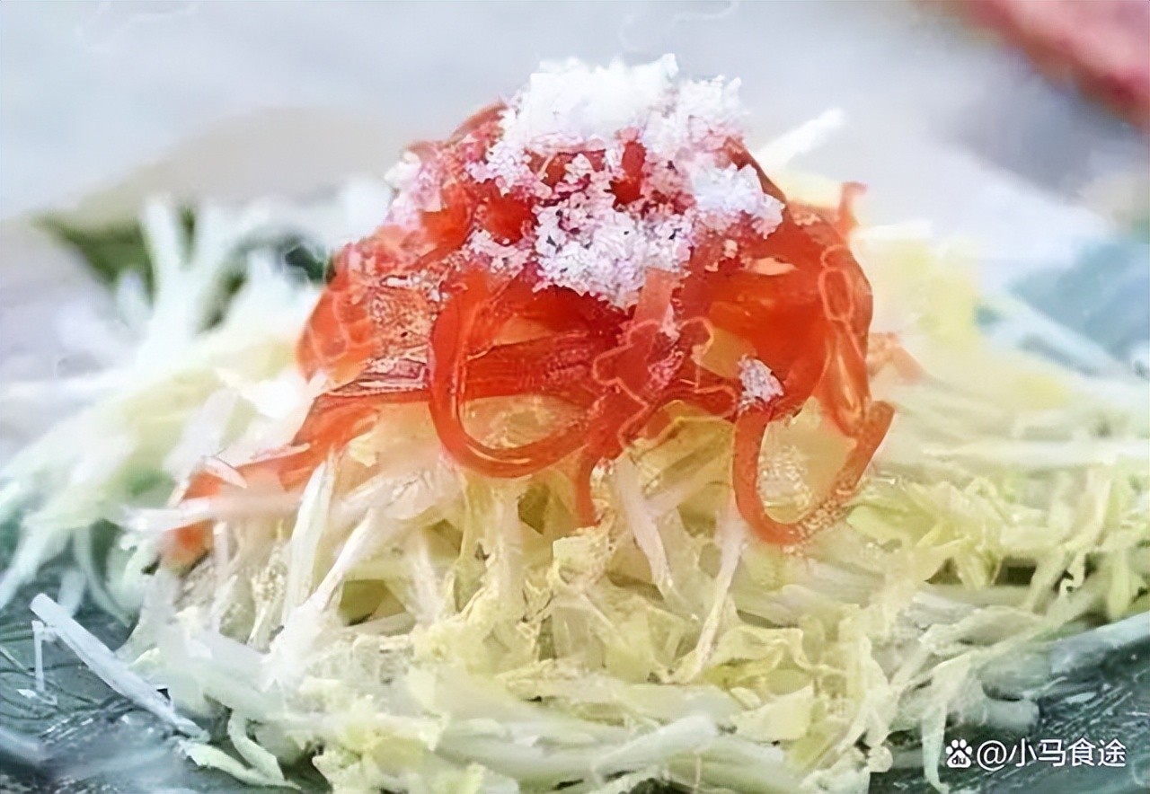 1.白菜帮改刀切丝或者切凤尾花刀,放入冰凉的清水盆中浸泡一小会儿,捞出控干水分,纳入盆中。