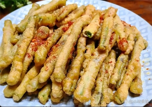 2.茄丁裹粉,下入油锅炸熟捞出沥油。