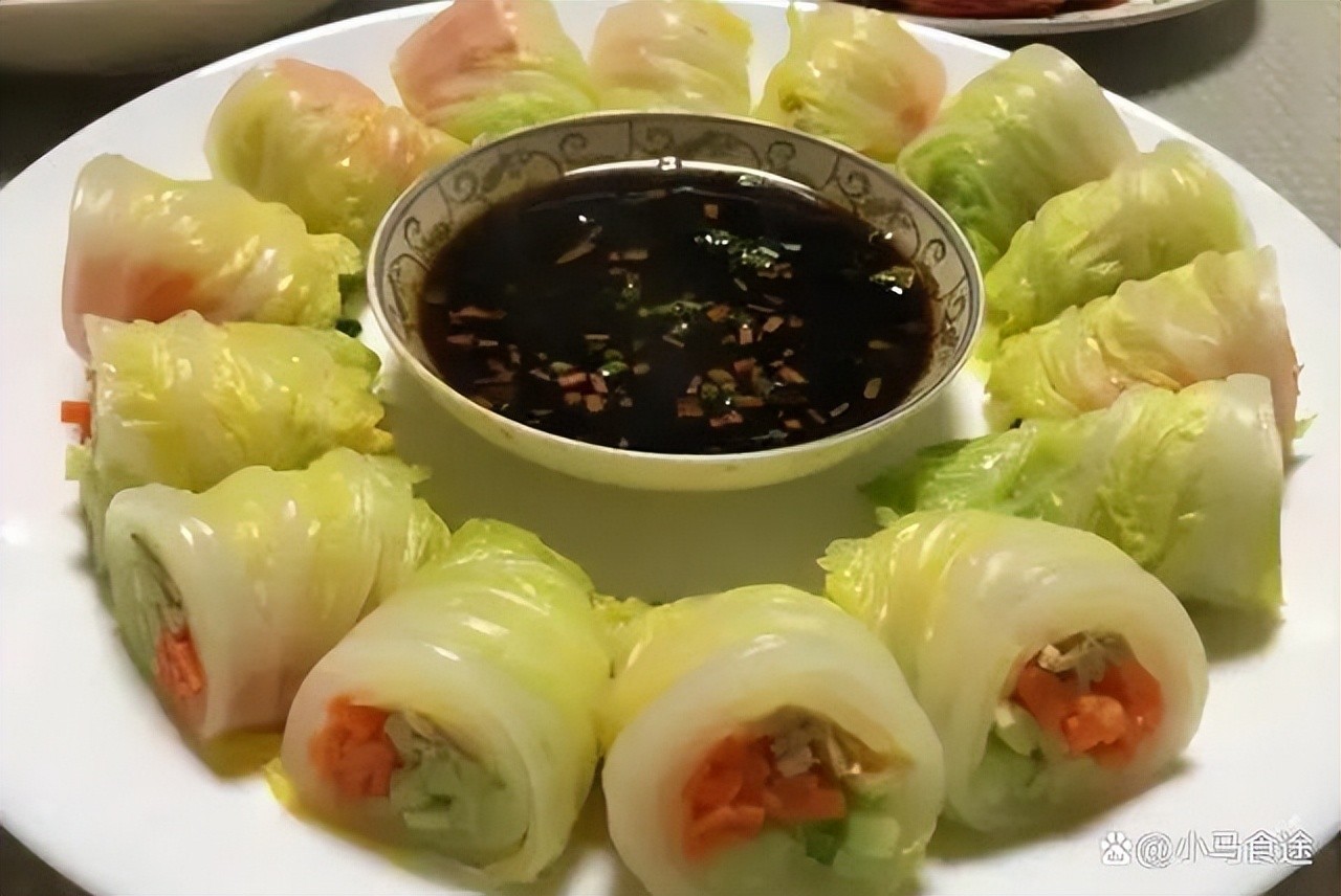 1.取适量白菜叶,开水汆烫出锅放冷。青萝卜、胡萝卜、豆腐皮分别改刀切成细条。将三丝卷入白菜卷中,从中间切开,摆入盘中。