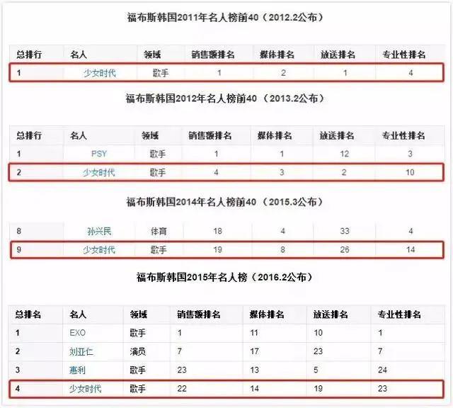 少女时代成员 " 团体致富 " 不是没有原因的,2011 年 -2015 年少女时代均位于福布斯韩国名人榜前十名。分到个人手里,肯定也不少。