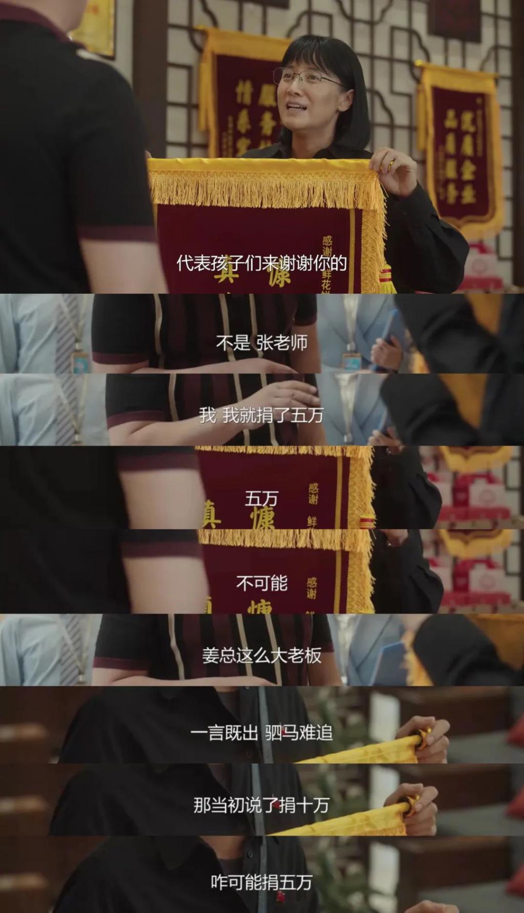 为了筹集建女高的资金,张桂梅老师只好向云南当地的鲜花饼大王姜总"化缘"。她想出来一个招,做了一面锦旗,把姜总原先承诺的五万元写成了十万元。