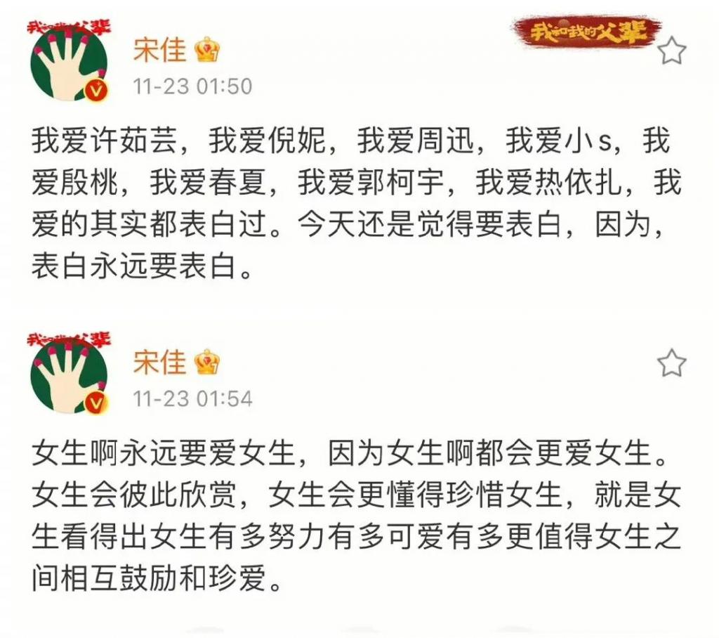 甚至就连宋佳对女性天然的欣赏也和张桂梅老师毫无二致。她有一次喝醉酒之后,在微博上对自己欣赏的女明星们大肆表白。